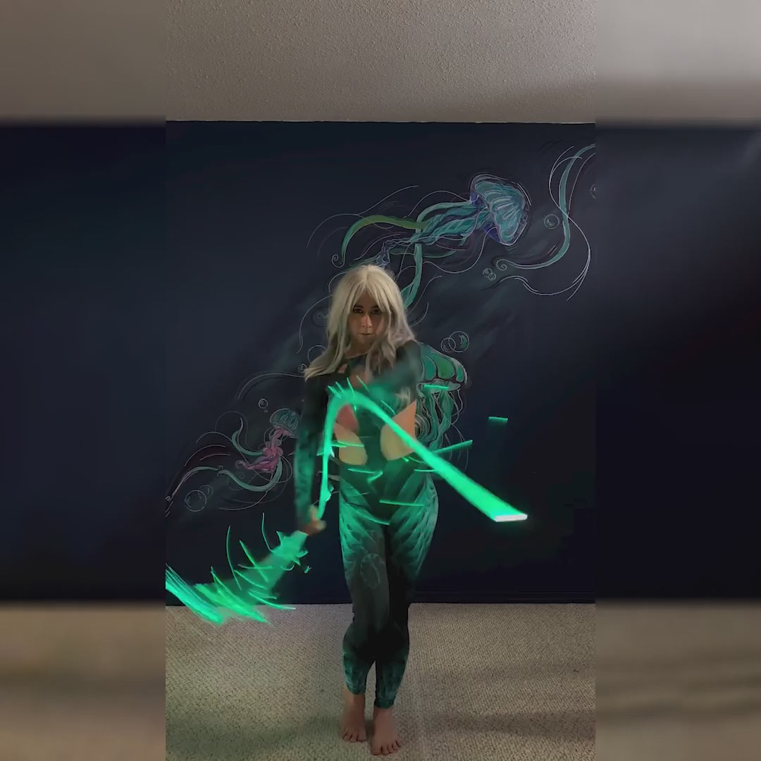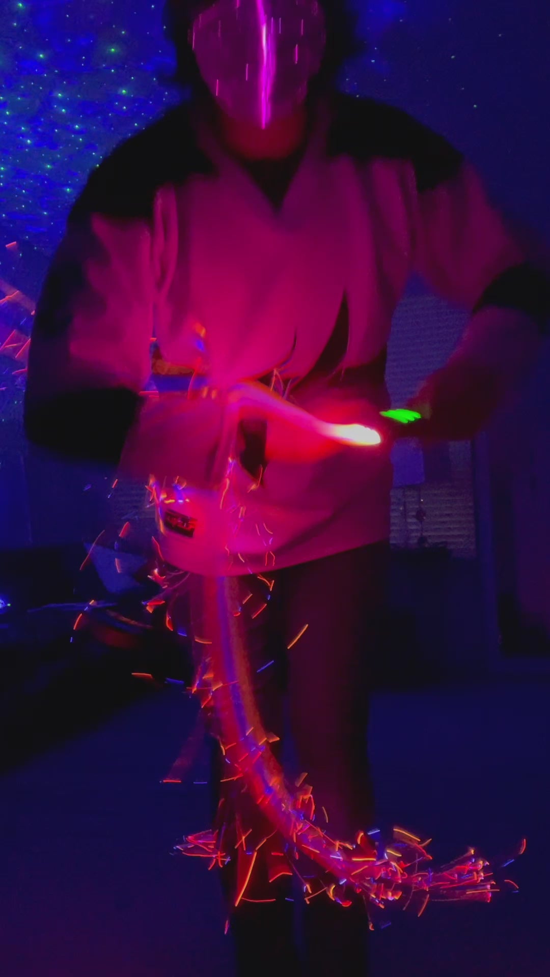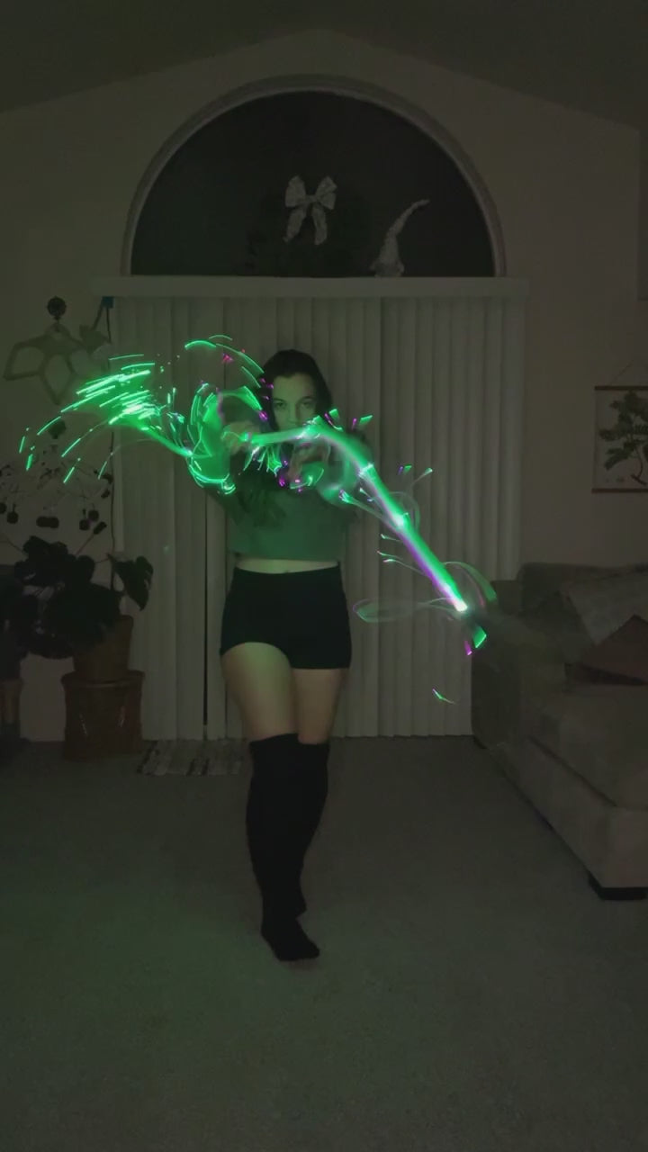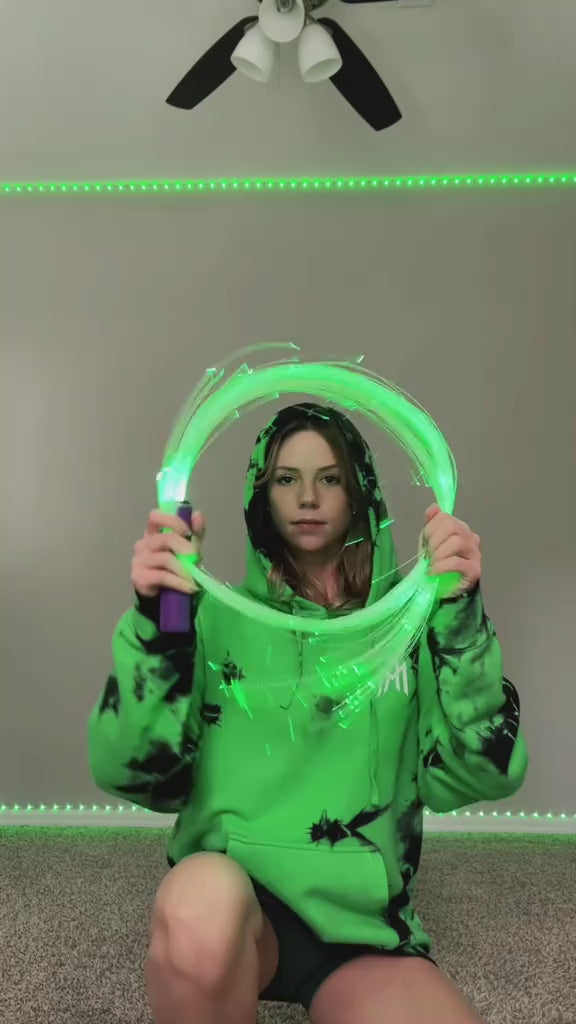 The BitWhip Accessory is a fiber optic whip twist-on accessory designed for the RGB Critter BT Flashlight (sold separately). It features a bundle of fiber optics secured within a 360-degree rotating bearing, allowing for smooth movement and trippy, glowing light trails.